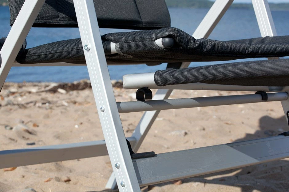The footrest clicks into place on the cross bar under the seat of the chair. The footrest is in matching fabric and has a lightweight aluminium frame. It is simple and easy to fold up and takes up minimal space when stored away and during transportation.