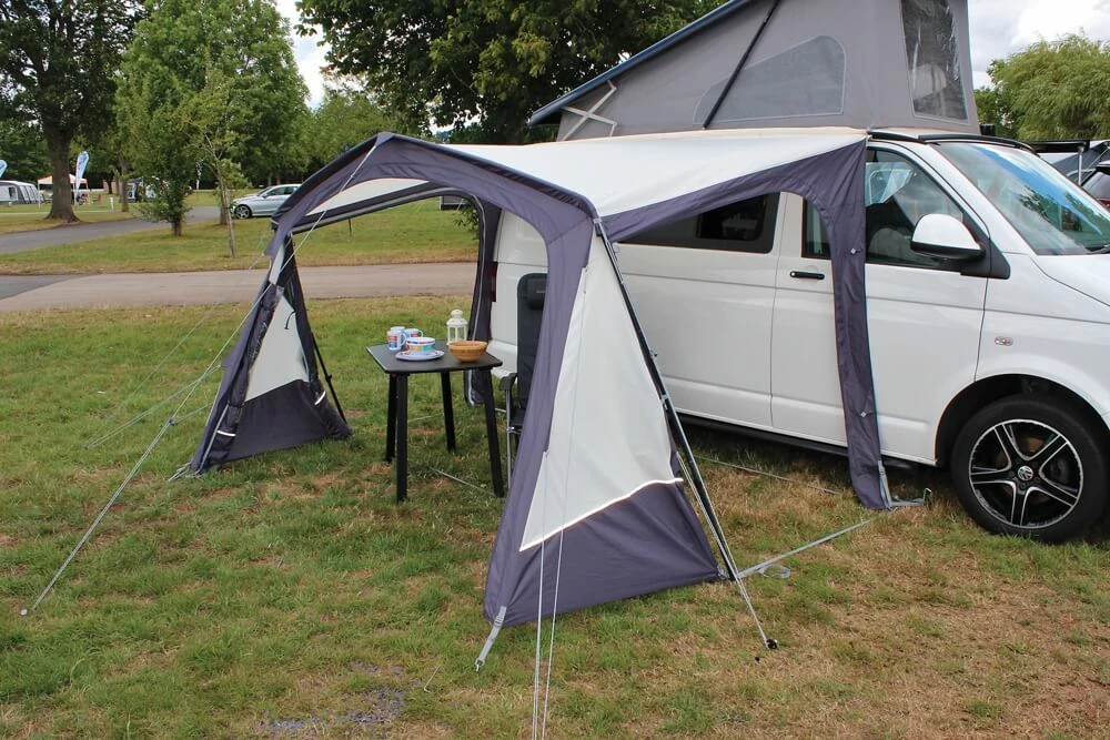 ย Brand new for 2019, Outdoor Revolutionโs โSportline Canopiโ is a sealable sheltered canopy/porch area, designed specifically to fix to the majority of campervans, providing a private extension of usable living space on those touring holidays. It is crafted from a waterproof 180HDE fabric, plus utilises a single adjustable steel pole frame to ensure maximum stability and support. Expansive crystal-clear PVC windows permit an excellent vista of the surrounding outdoors, whilst zip back side doors ascertain ease of access to and from the vehicle. The canopy comes complete with reflective storm straps and steel pegs.