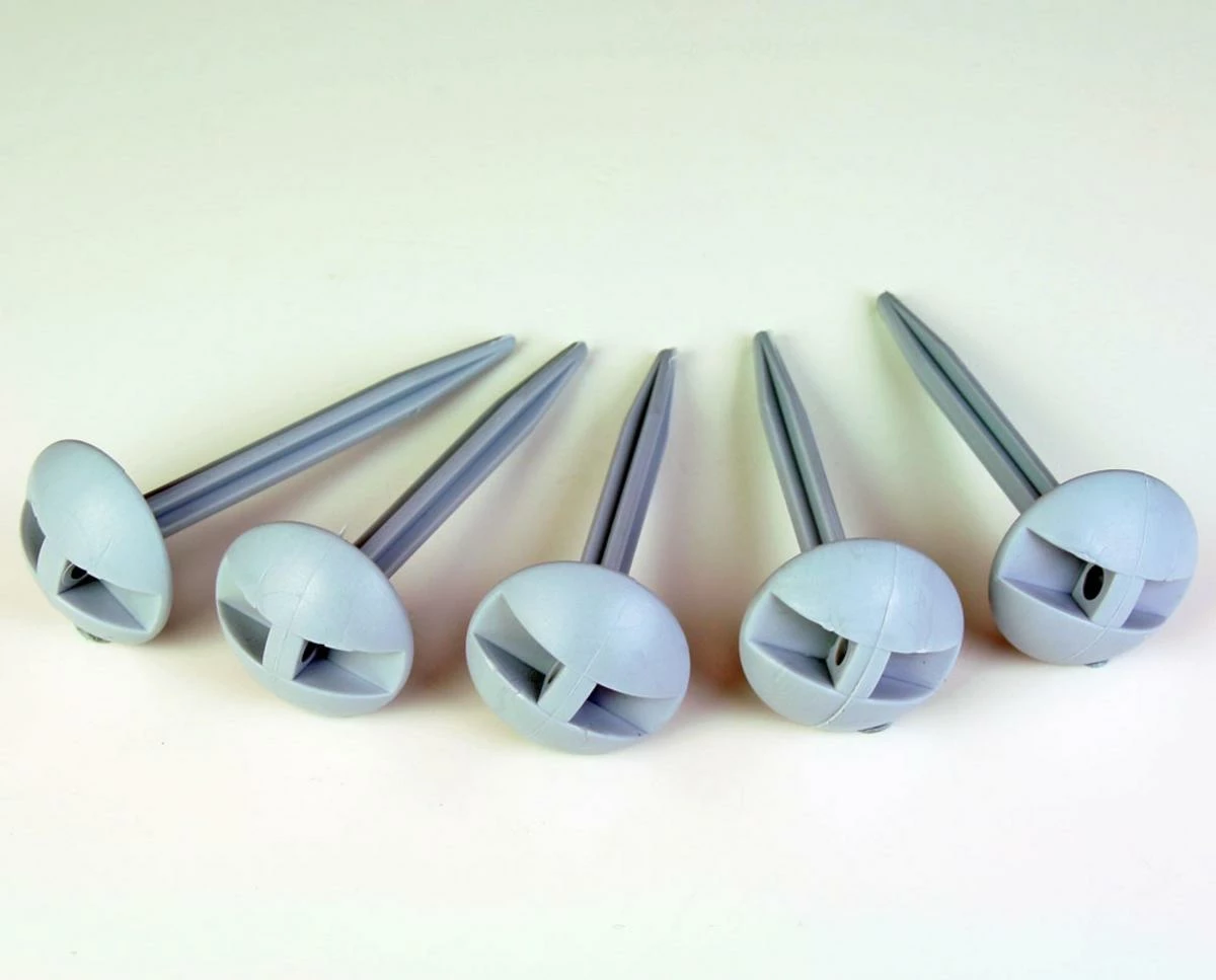 Kampa 9cm / 3.5″ Plastic Groundsheet Peg is Ideal to secure all types of tent groundsheets with eyelets, these plastic groundsheet pegs are highly visible to prevent loss and accidents that involve tripping over. Sold separately, the basic design of these groundsheet tent pegs include small ridges to grip the pegs better when in the ground, while the large circular tip helps to hold the groundsheet in place. The Kampa plastic groundsheet peg will also pull from the ground easily, making the groundsheet peg better than tent pegs for securing groundsheets as the peg will simply be pulled from the ground if tripped over, rather than the risk of tearing the groundsheet.
