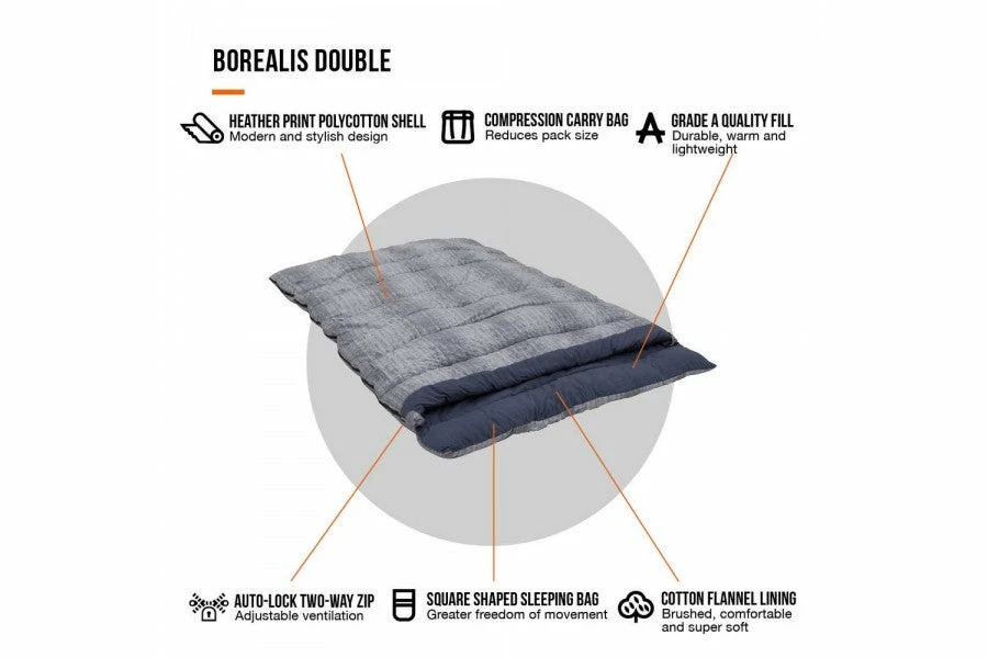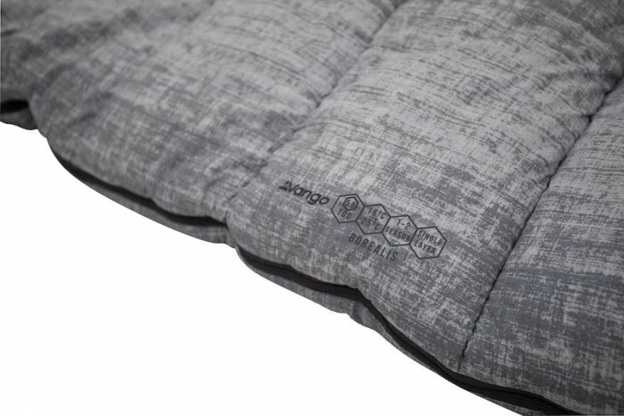 The Vango Borealis Double sleeping bag has been designed for those looking for a summer bag with small pack size. This square shaped sleeping bag benefits from ThermoLock Pro insulation, increasing durability and loft, keeping you warm and comfortable on warmer nights. Made with our luxurious cotton flannel lining and Heather Printed Polycotton Shell, the Borealis will be your go-to every summer. The double size gives you the flexibility to use as two single sized bags.