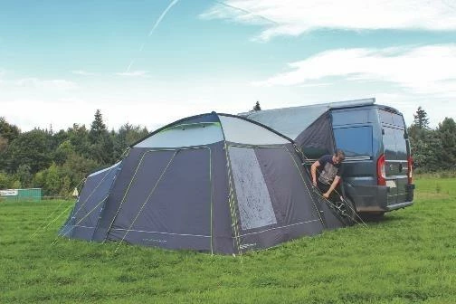 The drive-away comes complete with Storm Strap Attachment Points, a Peg Pack and a Zip-Up Front Door (with Velcro at the Bottom of the Doors) to help retain its shape in the wind. A Stone Protection Footprint Groundsheet (for added protection against sharp rocks and hard ground) and Canopy Poles (to create a functional, sheltered porch area using the front door) can also be purchased for this product.