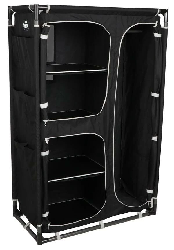This Royal Medium Black camping wardrobe is portable, with a metal frame and tear resistant fabric.It comes with 4 shelves and 2 separate compartments, with hanging area and side pockets. Its zipped front panel can be left open for access or closed for safe storage. The unit folds flat, so it is a very compact and handy accessory to have on any excursion.