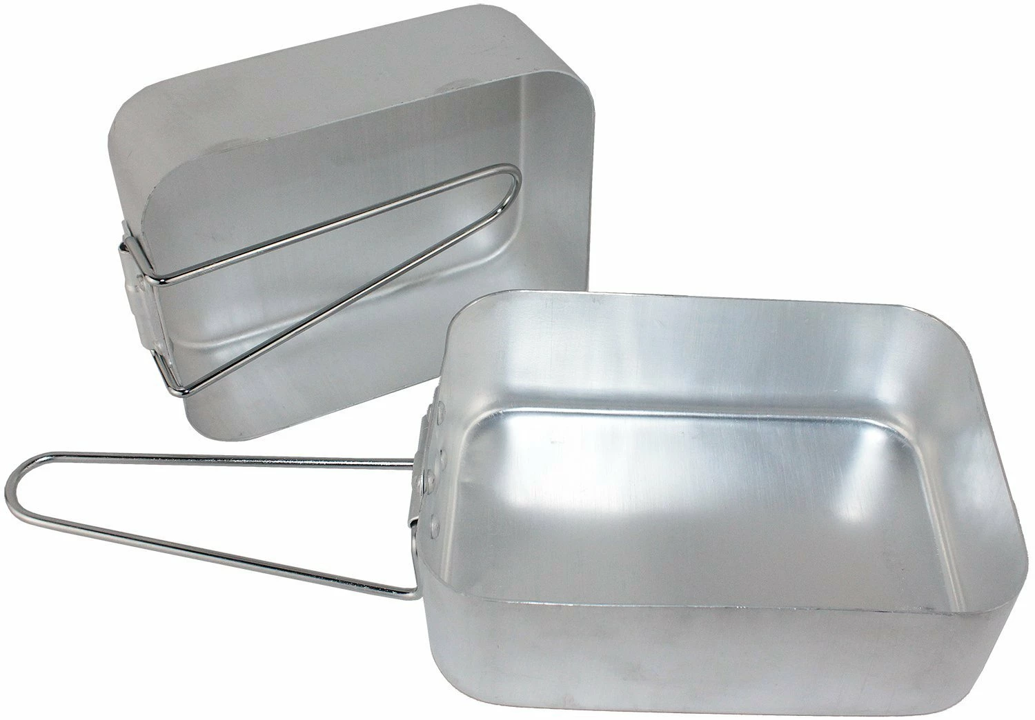 2 Piece Mess Tins Army Mess Tins This is a Military style 2 piece mess tins made from very tough alloy. It is a favourite and used by the military, campers and anyone who is going outdoors and wanting a compact mess tin set. 2 mess tins that fits into one into the other for storage.