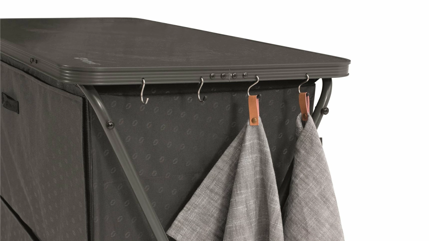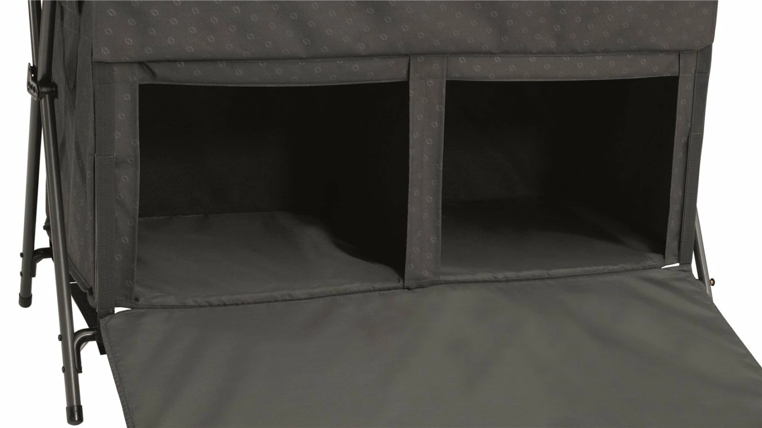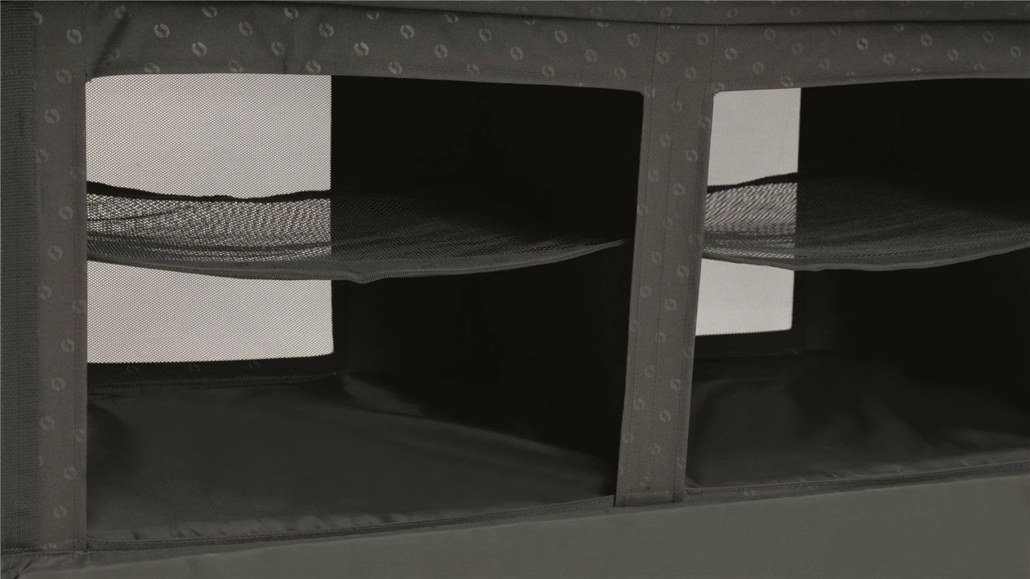 The Outwell Storage Collection offers cupboards and wardrobes plus neat bedside units that are all stable, simple and fast to set up, adding flexible storage space, underlined by our innovative and noise-free magnet door options. Secured with sewn-in magnets rather than zips, each door is set up quickly with a fibreglass frame that can be removed for rolling away the door and toggling it open.