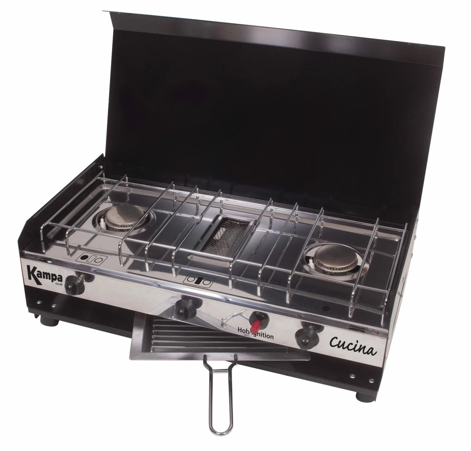 The Kampa Cucina is a more traditional double burner and grill with a sturdy steel box construction with stainless steel burners and hob top. The Cucina has two powerful 2.6kW high speed burners and a 1.5kW high speed grill. It also features a convenient Piezo ignition for the hob and three heat adjuster knobs.