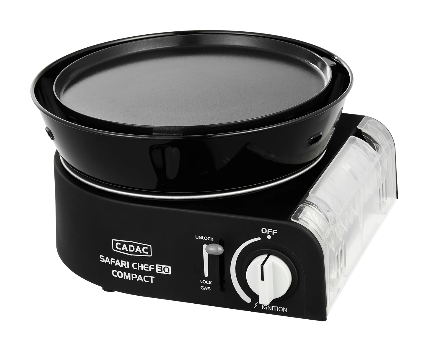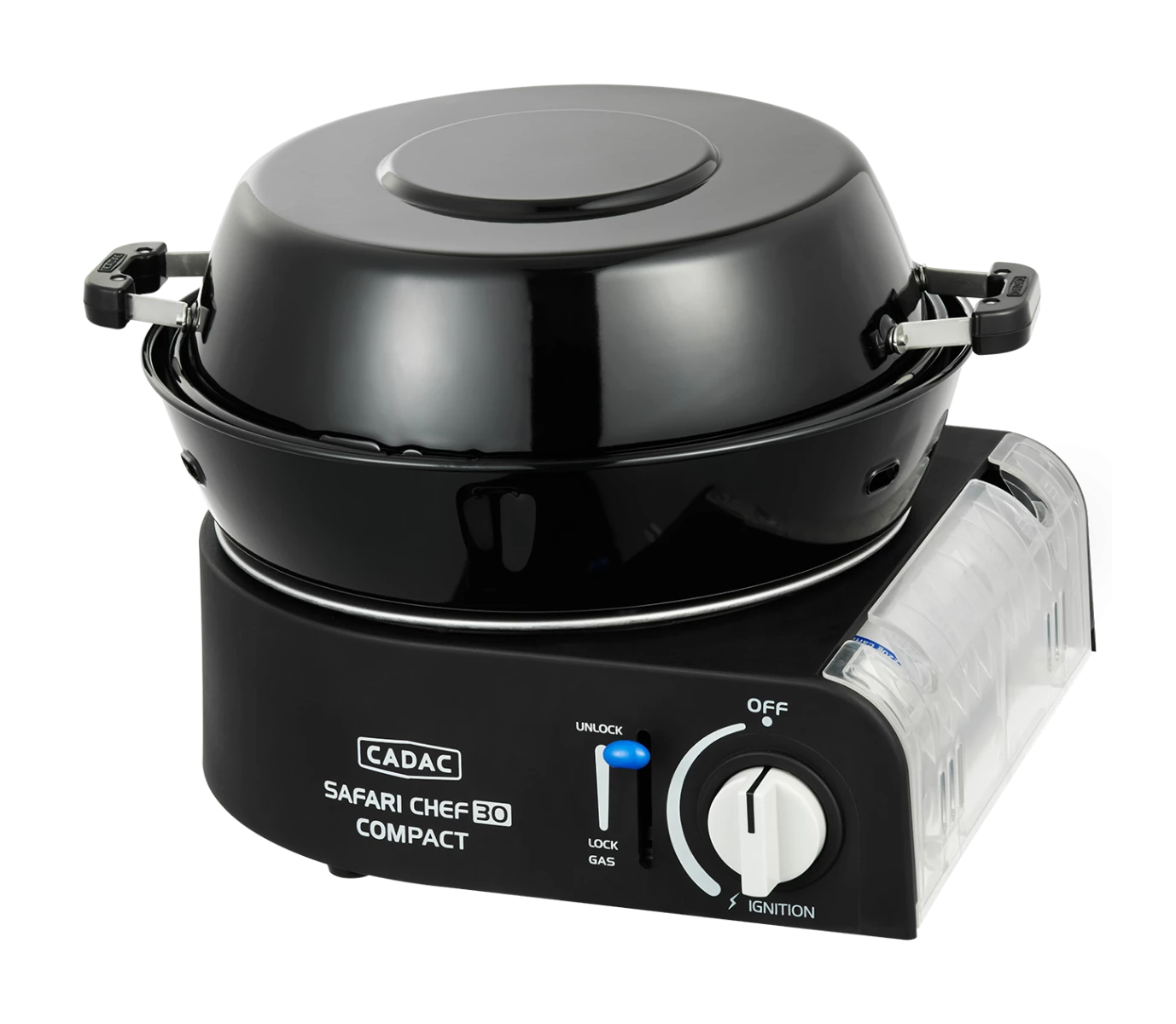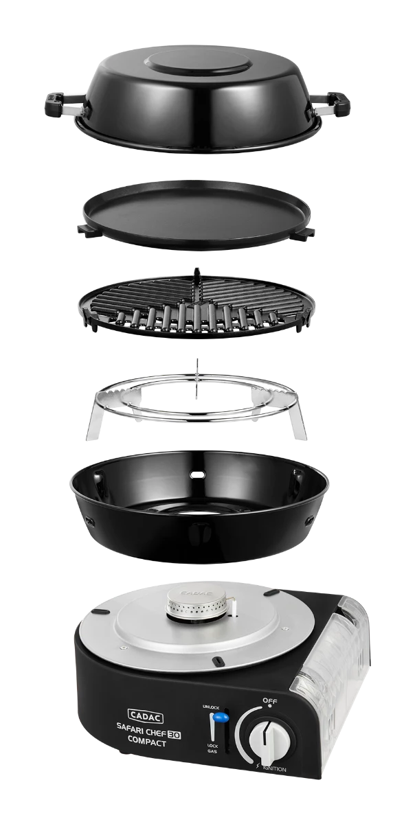 The NEW Safari Chef 30 Compact is an ultra compact & lightweight gas barbecue. It works directly of a 227gr gas cartridge. Simply place it in the appliance, tighten with the handle and start cooking or grilling. The perfect appliance for outdoor activities and camping holidays.