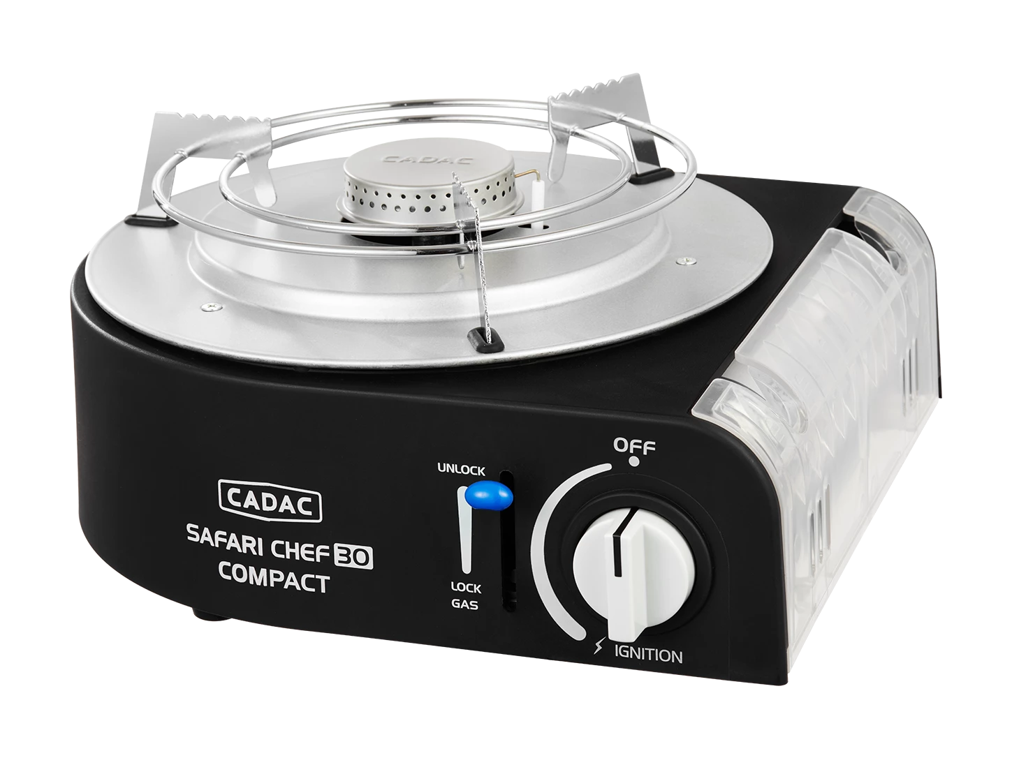 Despite its small size, the Safari Chef Compact is extremely versatile due to the various cooking tops included; a pot stand, BBQ grid, flat plate and pot/lid. Use the pot stand to cook a pot of soup or pasta. The BBQ grid and flat plate have CADAC’s GreenGrill coating and are perfect for baking and grilling meat, fish and vegetables. The lid can also be used as a pan and is therefore multifunctional.