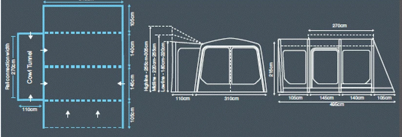 - Inflatable Front Vestibule – Integral 105cm Deep Front Porch Area Extending Usable Living/Storage Space, With Additional Protection Against the Elements.