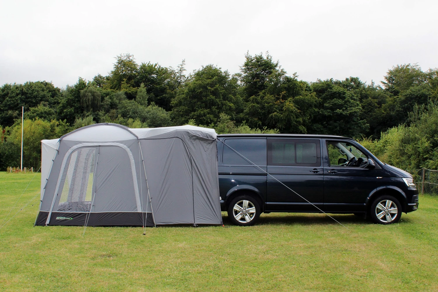 The ever-popular Cayman Tail poled drive-away awning is a perfect choice for those looking to create a versatile covered area at the rear of their vehicle. With just 2 fibreglass poles making up the main body of the awning, it is both quick and simple to pitch, and structurally very stable. Available to fit vehicle heights of up to 240cm the fully adjustable connection cowl offers a snug fit to most vans and SUVs. There are large access doors on all sides of the awning meaning in fair weather the awning can be opened completely to double-up as a shelter or gazebo. There are also entry doors on both sides of the cowl to allow access to the vehicle without the need to come through the awning. The Cayman Tail comes complete with a wealth of features including an integral eyebrow canopy, a ‘fold-flat’ sewn-in groundsheet, mesh ventilation, clips to attach an optional 2 berth bedroom inner tent, and Velcro fixings for our LED lighting system.