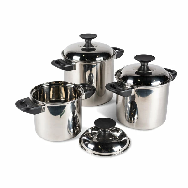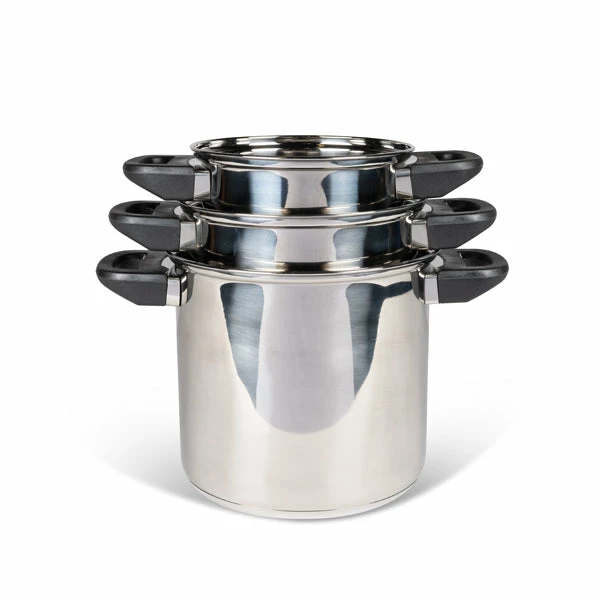 Lightweight and strong with its high-quality stainless-steel construction, the Space Saver offers space saving design where this three-pan cook set nests together for compact storage