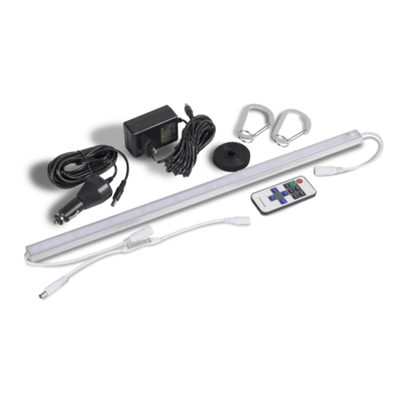 Each sabre link system is controlled using a remote control that comes in this starter kit which allows you to switch the lights on and off and also dim and brighten them. In poled awnings & tents, the lights can be hung from the horizontal poles using the carabiner clips and velcro provided.