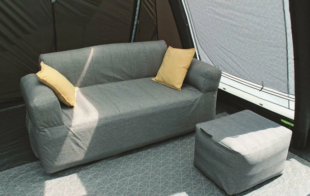 The Campese Thermo Two Seat Sofa is a luxury inflatable 2 person camping sofa, designed for extra warmth, comfort, & support. Includes 2 handy side storage pockets for magazines etc… in a new stylish blue grey mottle padded fabric colour.