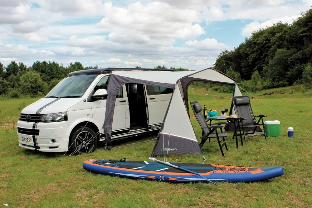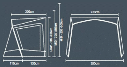 The ‘Techline Canopi’ is created from a waterproof 180HDE fabric and supported by a single, adjustable steel pole frame. It has been especially designed to fit caravans, motorhomes and campervans with thanks to its three cowl height options: Lowline, Midline and Highline. It provides the ideal accessory to extend usable living space from