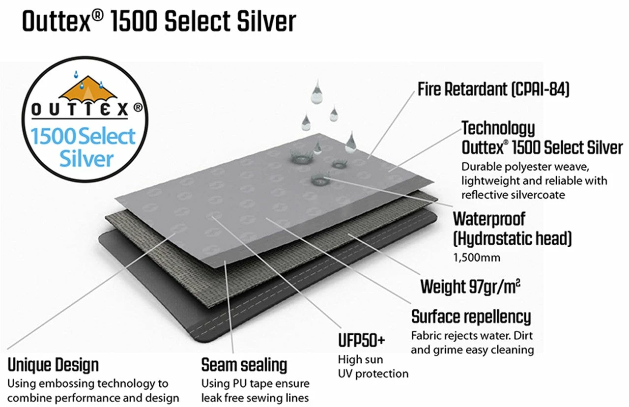- Flysheet: Outtexยฎ 1500 Select Silver, 100% polyester