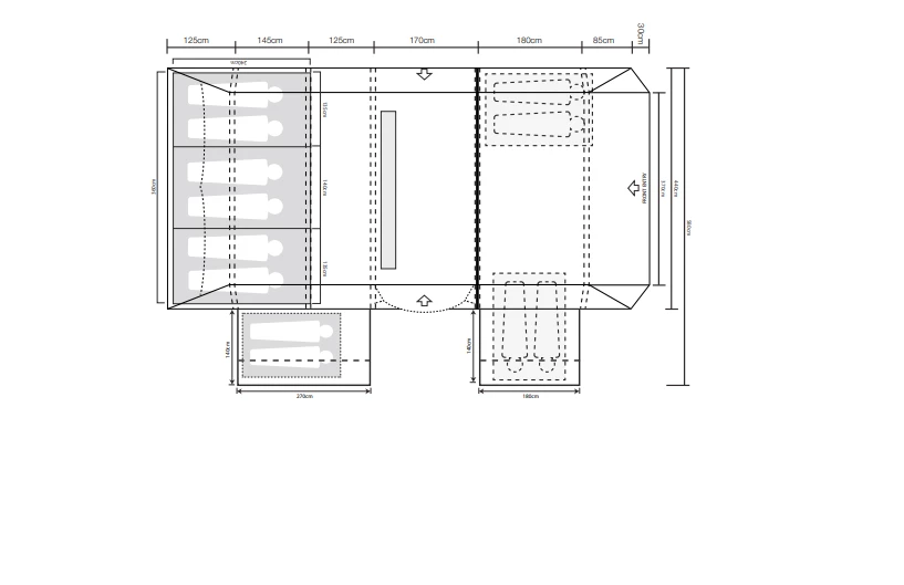 - 240cm deep, darkened micro polyester 6 person bedrooms with zipped 2/2/2 dividers